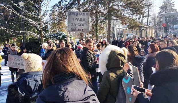 Protest je organizovan kako bi se uputio javni zahtjev da materinski dodatak od 405 KM mjesečno primaju sve nezaposlene majke koje imaju djecu do 12 odnosno 18 mjeseci starosti, a ne samo majke beba rođenih od decembra ove godine.