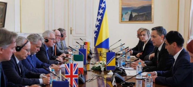 Predsjedavajući Predsjedništva Bosne i Hercegovine Denis Bećirović održat će danas u 18 sati sastanak s ambasadorima država članica Kvinte (Sjedinjene Američke Države, Savezna Republika Njemačka, Republika Francuska, Ujedinjeno Kraljevstvo Velike Britanije i Sjeverne Irske i Republika Italija), potvrđeno je iz Predsjedništva BiH.