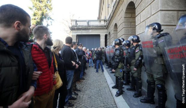 Demonstranti su juče satima blokirali ulaze u zgradu predsjedništva Srbije, za vrijeme obraćanja predsjednika Aleksandara Vučića, potom su protestovali ispred Policijske uprave za Grad Beograd, zahtijevajući da se oslobode ljudi koji su uhapšeni u vezi sa subotnjim i nedjeljnim protestima.