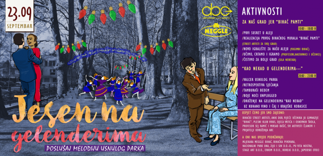 U organizaciji udruženja ABC, i ove godine u Bihaću će se održati manifestacija pod nazivom “Jesen na Gelenderima”, a koja ima za cilj oživjeti tradicionalno druženje u Gradskom parku u Bihaću, odnosno na nekadašnjem kultnom okupljalištu građana Bihaća – Gelenderima.