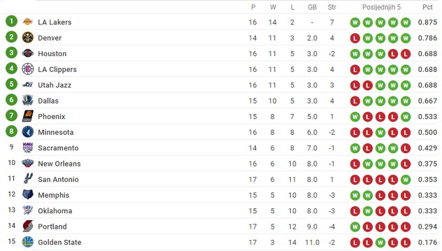 Tabela Zapadne konferencije: