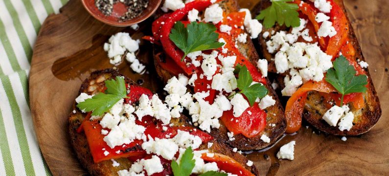 2. Na svako parče hljeba staviti po krišku feta -sira, pa preko poredajte tračice pečene paprika. Poprskajte maslinovim uljem i pecite oko 15 minuta na 200 stepeni.