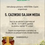 Udruženje pčelara “Kesten” Cazin organizuje peti po redu “Cazinski sajam meda” koji počinje u srijedu, 30. oktobra. Sajam će se održavati na platou ispred Trgovačkog centra “Ljiljan” od 30.10. do 02. novembra 2019. godine. Broj izlagača je ograničen zbog prostora, a prednost pri popunjavanju slobodnih mjesta imaju članovi udruženja. Za posjetioce će biti upriličena degustacija meda i drugih pčelinjih proizvoda.