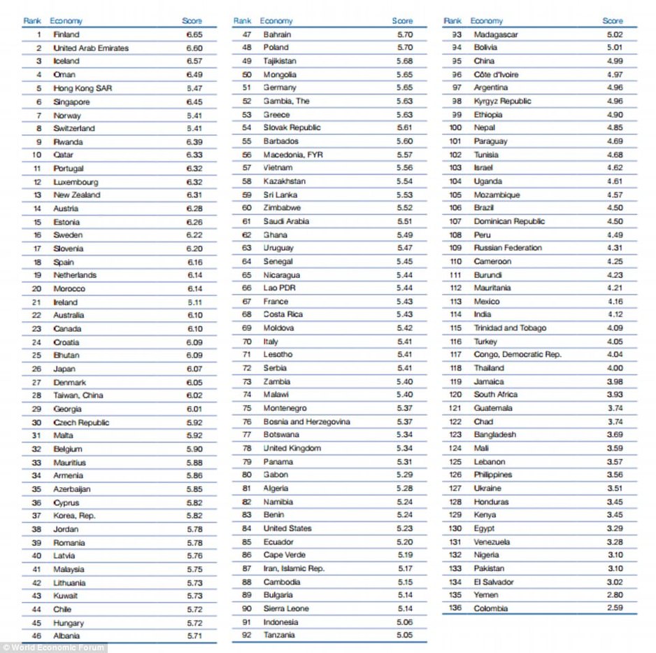 Oman je zauzeo četvrto mjesto, a odmah potom su Hong Kong, Singapur i Norveška na petom, šestom i sedmom mjestu. Švicarska je na osmom, Ruanda na devetom, a Katar na desetom mjestu.
