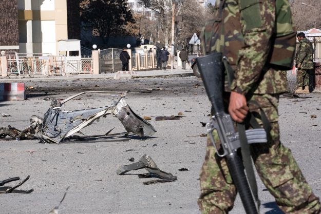 KABUL, AFGHANISTAN – JANUARY 18: A car destroyed in a blast lies in the street following clashes between Taliban-linked militants and security forces on January 18, 2010 in Kabul, Afghanistan. Taliban militants launched multiple suicide attacks at key government targets. At least five people were killed and nearly 40 others wounded in fighting between Taliban militants and security forces, the public health ministry said. The death toll did not include four militants who were also killed during the attacks, which lasted more than three hours. President Hamid Karzai had stated that security had been restored to the capital. (Photo by Majid Saeedi/Getty Images)