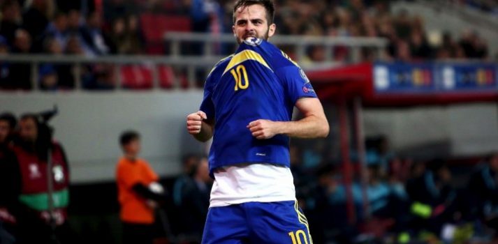 Miralem Pjanić je namjestio loptu na 30 metara od gola, sjajno je šutirao, a lopte se od leđa grčkog golmana odbija u mrežu za erupciju oduševljenja i vodsvo naše selekcije od 1:0. Potom je zbog bakljade sukoba na tribinama meč nakratko prekinut, da bi do kraja prvog dijela Grčka imala veliku šansu da izjednači. Mitroglou je izašao sam pred Asmira Begovića, ali ovaj mu sjajno brani i na odmor se odlazi vodstvom naše selekcije.