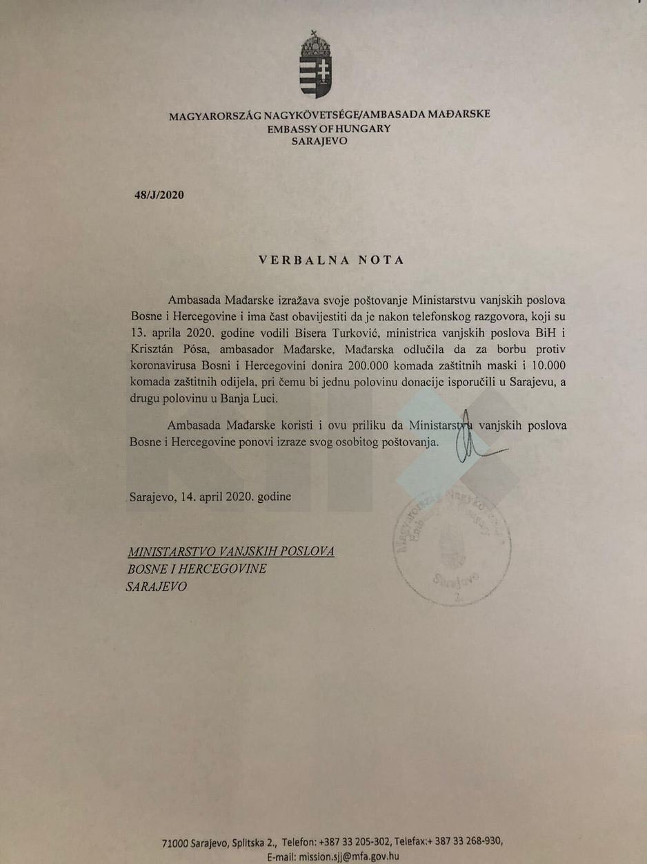 Ambasada Mađarske je u verbalnoj noti upućenoj Ministarstvu vanjskih poslova BiH danas navela da je nakon telefonskog razgovora s ministricom Turković i ambasadorom Mađarske u BiH Krisztiánom Pósom Mađarska odlučila za borbu protiv koronavirusa BiH donirati 200.000 komada zaštitnih maski i 10.000 komada zaštitnih odijela, pri čemu bi jednu polovinu isporučili Sarajevu, a drugu polovinu Banjoj Luci.Član Predsjedništva BiH Milorad Dodik je jučer još zahvalio premijeru Mađarske Viktoru Orbanu i naveo da će se u kontingentu pomoći iz Mađarske naći respiratori, zaštitne rukavice, maske i druga medicinska oprema neophodna za borbu protiv koronavirusa u RS-u.