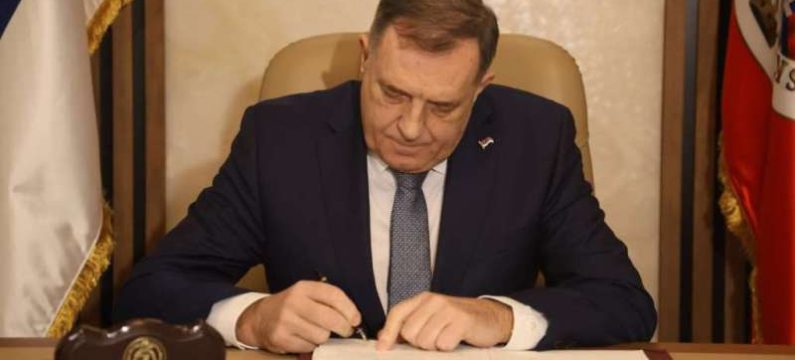Predsjednik Republike Srpske Milorad Dodik je sinoć u Banjoj Luci potpisao ukaze o proglašenju zakona o zabrani djelovanja Suda i Tužilaštva Bosne i Hercegovine, SIPA-e i VSTV BiH u ovom entitetu. Ove neustavne zakone je usvojila Narodna skupština RS-a na posebnoj sjednici održanoj 27. februara ove godine.