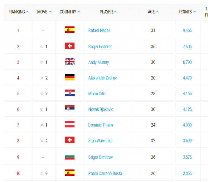 Pobjedom na posljednjem Grand Slam turniru sezone US Openu Španac Rafael Nadal učvrstio se na vodećoj poziciji, drugi je Roger Federer, koji je na treće mjesto potisnuo Britanca Andyja Murrayja, dok su na četvrto i peto mjesto napredovali Nijemac Alexander Zverev i Hrvat Marin Čilić.