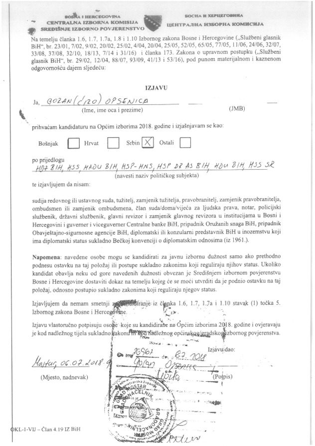 “Na sudu su predmeti. Ne bismo komentarisali ništa dok se ne okonča žalbeni postupak”, kazali su nam u Centalnoj izbornoj komisiji BiH, napominjući da se neće grafološki utvrđivati izjava Gorana Opsenice na kojoj se izjasnio kao Srbin.