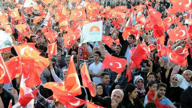 Okupljeni su uzvikivali slogane u znak podrške predsjedniku Redžepu Tajipu Erdoganu, koji je na vlasti više od deset godina. Erdogan, koji prema turskom Ustavu ne treba da bude uključen u predizbornu kampanju, gaji ambiciju da njegova vladajuća Partija pravde i razvoja (AKP) pobijedi na predstojećim izborima i osvoji dvotrećinsku većinu u parlamentu.