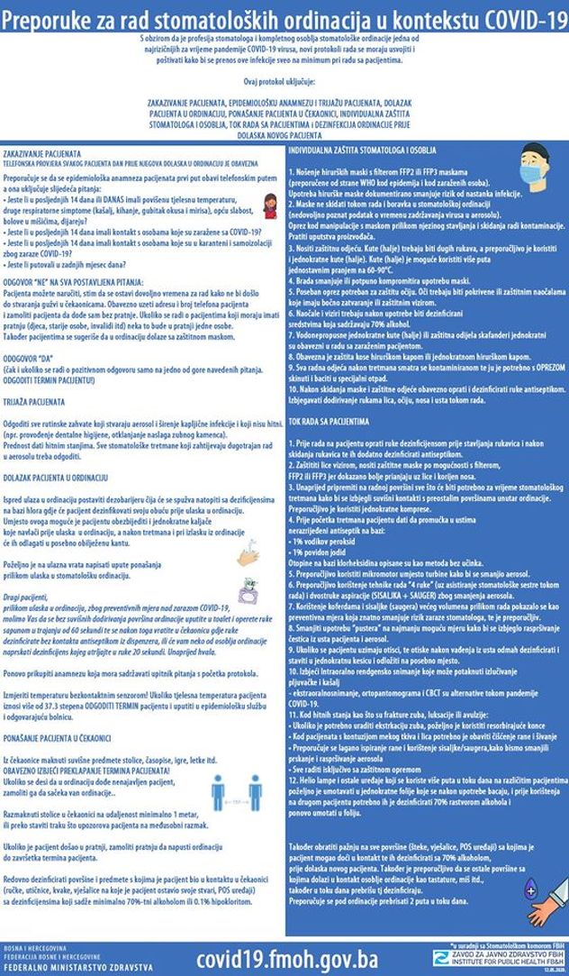 S obzirom da je profesija stomatologa i kompletnog osoblja stomatološke ordinacije jedna od najrizičnijih za vrijeme pandemije COVID-19 virusa, novi protokoli rada se moraju usvojiti i poštivati kako bi se prenos ove infekcije sveo na minimum pri radu sa pacijentima.