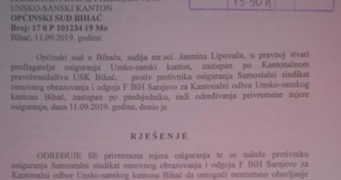 Općinski sud u Bihaću u srijedu je donio rješenje po tužbi zastupanoj po Kantonalnom pravobranilaštvu USK, kojim se određuje „privremena mjera osiguranja“ protiv Kantonalnog odbora Samostalnog sindikata osnovnog i srednjeg obrazovanja FBiH u Bihaću.