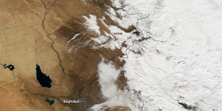 Snijeg je nešto češća pojava na sjeveru Iraka, gdje je pao u Mosulu, ali se rijetko može vidjeti u centralnom i južnom dijelu zemlje.