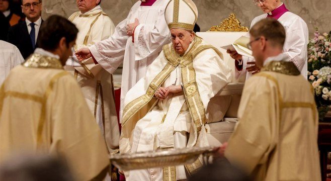 Nakon što je započeo službu u zadnjem dijelu crkve tradicionalnim paljenjem velike svijeće, odveden je u invalidskim kolicima u prednji dio da predvodi misu.