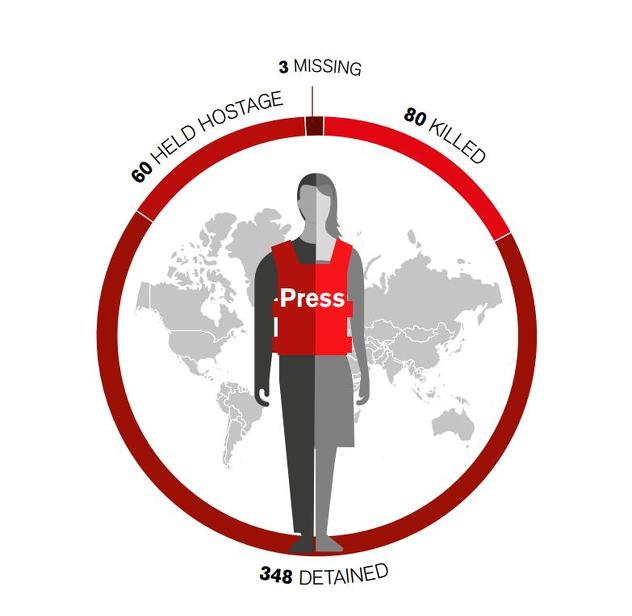 Kina, Iran, Saudijska Arabija, Egipat i Turska su zemlje u kojima novinare najviše šalju u zatvor zbog njihovog rada. U kineskim zatvorima trenutno se nalazi 60 novinara. Sudbina zarobljenih novinara u ratnim zonama u Siriji još nije poznata. Oslobođen je samo japanski novinar Jumpei Yasuda. Troje novinara, dvoje iz Latinske Amerike i jedan iz Rusije, vode se kao nestali.