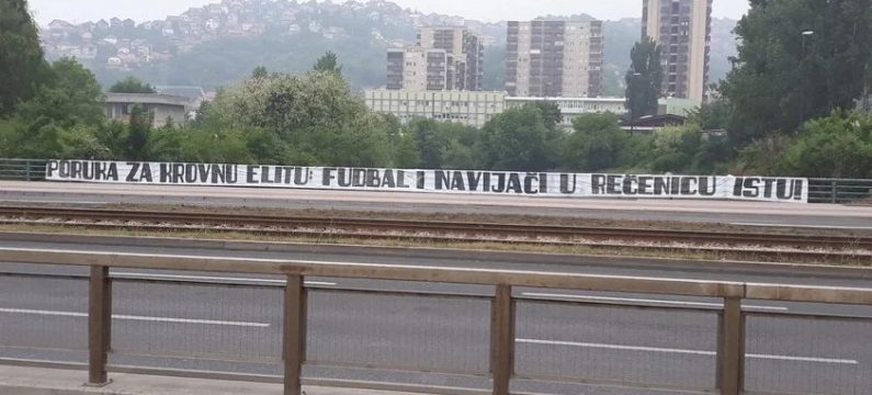 “Poruka za krovnu elitu: Fudbal i navijači u rečenicu istu“, stoji na transparentu koji je osvanuo na ogradi prekoputa zgrade NSBiH. Transparent je ubrzo i uklonjen.