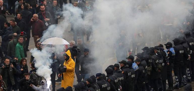 Tokom današnjih protesta pristalica ujedinjene albanske opozicije u Tirani, demonstranti, od kojih su pojedini nosili maske, zapalili su baklje i gađali kordon policije i zgradu vlade dimnim bombama, petardama i mastilom.