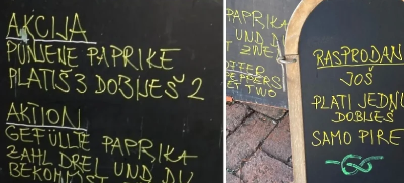 “Akcija, punjene paprike – platiš tri, dobiješ dvije”, glasi prva poruka, koja je bila ispisana i na engleskom te njemačkom jeziku.