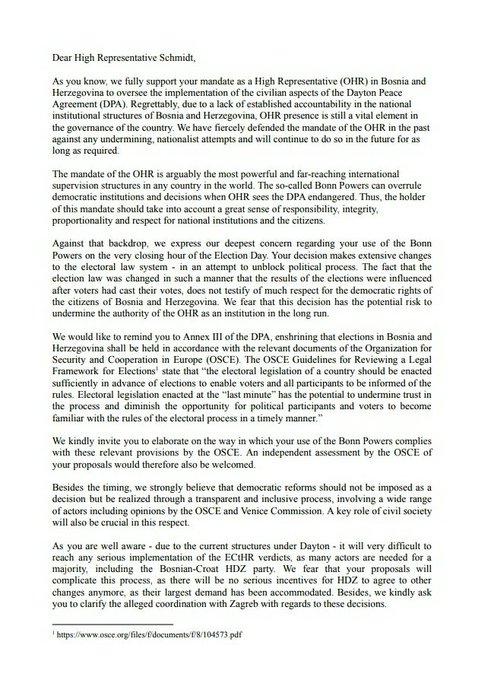“Duboko smo nezadovoljni zbog toga što ste bonske ovlasti iskoristili na dan izbora. Vašom odlukom desile su se opsežne promjene u izbornom sistemu u pokušaju da se deblokira politički proces (konstituisanje vlasti u FBiH). Činjenica je da su se izmjene desile tako da se utjecalo na izborne rezultate, i to nakon što su izbori održani. To nije puno poštivanje demokratskih prava građana Bosne i Hercegovine. U bojazni smo da je ovom odlukom stvoren potencijalni rizik da se dugoročno ugrozi autoritet OHR-a”, upozorili su.