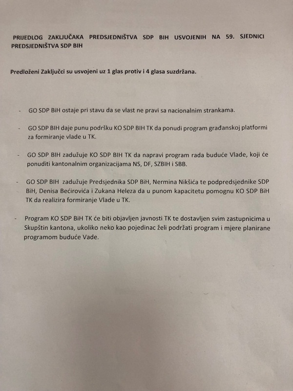 Na sjednici Glavnog odbora SDP-a izglasan je zaključak Predsjedništva ove stranke po kojem Kantonalni odbor iz Tuzle može pokrenuti pregovore o formiranju vlasti, ali bez pregovora sa nacionalnim strankama.