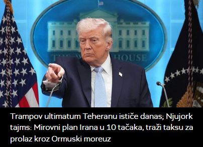 Trampov ultimatum Teheranu ističe danas; Njujork tajms: Mirovni plan Irana u 10 tačaka, traži taksu za prolaz kroz Ormuski moreuz