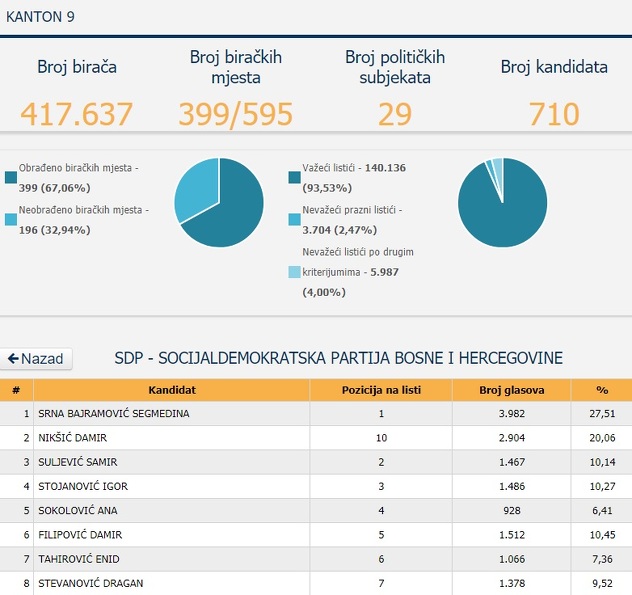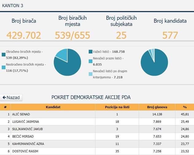 U Bosansko-podrinjskom kantonu je kandidat Liberalne stranke Nudžeim Džihanić bio 10. na listi, a ipak je uspio osvojiti 452 glasa, odnosno 25,58 posto. Dobar rezultat je ostvario i kandidat Stranke za BiH Sedin Hadžimusić, također 10. na listi, osvojivši 292 glasa, ili 23,66 posto.