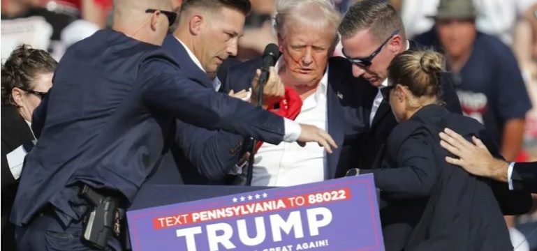 Agenti su podigli Trumpa na noge, njegova crvena bejzbol kapa sa natpisom “Učinimo Ameriku ponovo velikom” više mu nije bila na glavi, kosa mu je bila raščupana, desno uho krvavo, a po licu je imao tragove krvi.