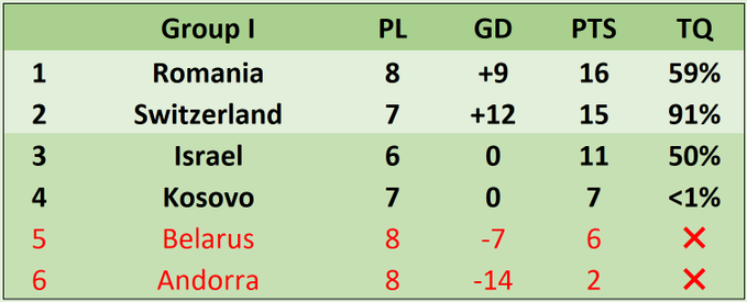 Podsjetimo, u Grupi I je na prvom mjestu Rumunija sa 16 bodova iz osam mečeva, slijedi Švicarska s 15 iz sedam pa Izrael s 11 iz šest utakmica i Kosovo sa sedam iz sedam susreta.
