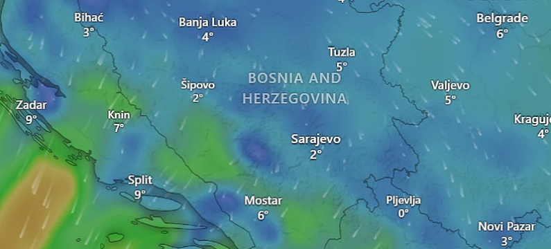 Vjetar u većem dijelu Bosne slab do umjerene jačine sjevernog smjera. U Hercegovini, zapadu i jugozapadu Bosne jak vjetar sjevernog smjera. Temperatura zraka većinom između 2 i 7 stepeni, na jugu zemlje od 7 do 12 stepeni celzija.